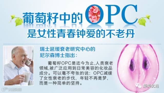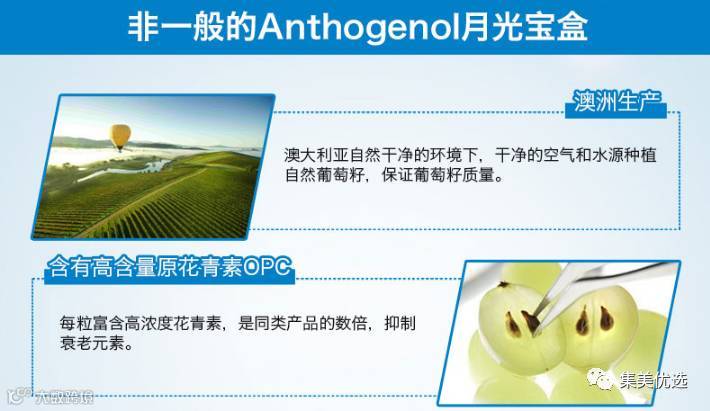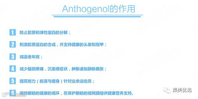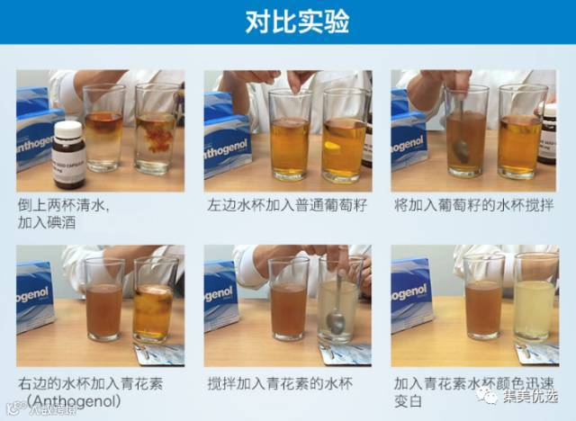 OPC(原花青素)是迄今为止发现的最高效的抗氧化除自由基剂,被誉为生命青春素。它的抗氧化自由基能力是维生素C的50倍、维生素E的20倍,具有活性度高的显著优点。超强的抗氧化能力使其可以有效对抗自由基导致的胶原蛋白交结现象发生。官网发布了一个小实验来证实anthogenol的抗氧化能力,取两瓶混有碘酒的清水,一瓶放入普通的葡萄籽,另外一瓶放入anthogenol葡萄籽精华。放入anthogenol的这瓶水轻轻搅拌后立刻恢复了透明的原色,而另外放入普通葡萄籽的却没有明显变化。