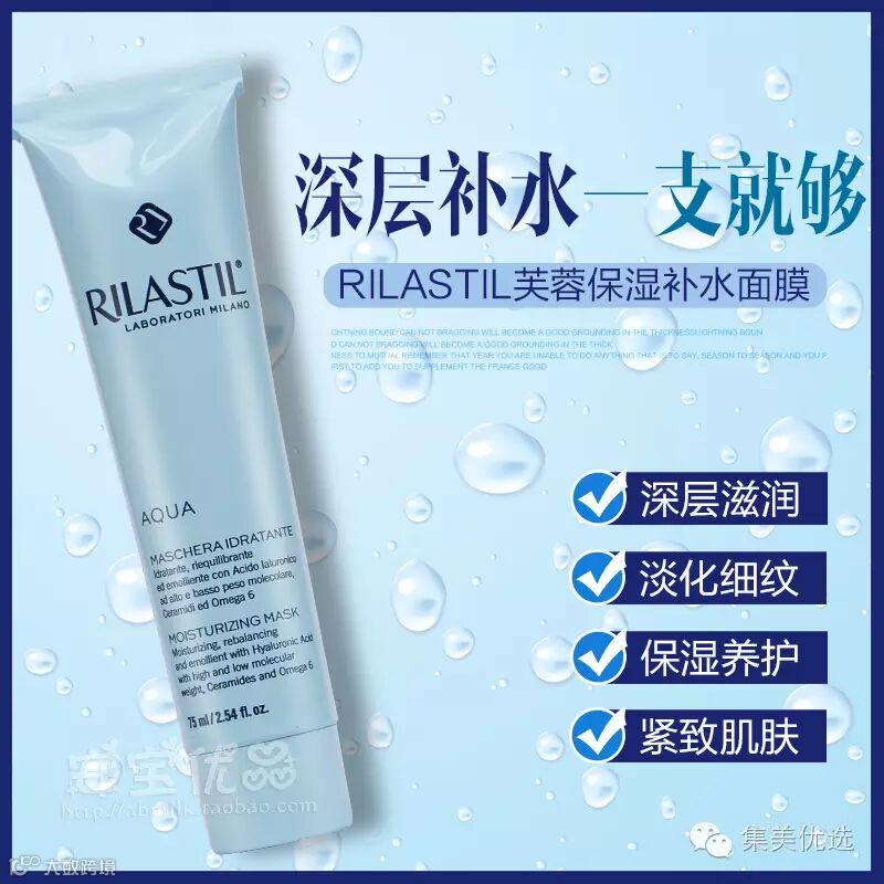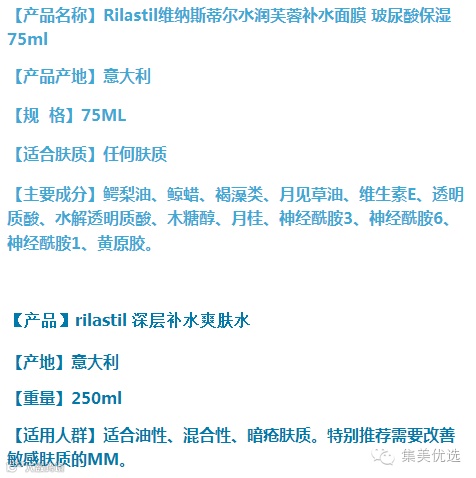 Rilastil维纳斯蒂尔芙蓉水润芙蓉补水面膜:属于滋润补水型面膜,含高科技生化技术精心挑选的特别成分,当滋润补水面膜紧紧贴在肌肤表面时,保湿因子迅速渗入肌肤基底层,特殊的透明质酸组合配方,高度持续补水及保湿功效,能加倍润泽及修护角质层,补充细胞间脂质和提高肌肤的保水力,美白、保护干燥肌肤,改善肌肤严重脱水及干燥状况,强化肌肤保湿及防护功能,让肌肤立刻恢复明亮光泽。