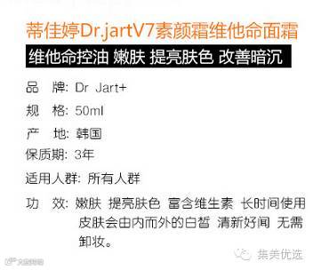 Dr.jart蒂佳婷V7维他命控油美白保湿面霜 功效是美白淡斑擦了不用卸妆~擦完皮肤很亮白自然通透那种~一分钟救回你的肤色暗黄不均不白皙~dr.jart在江南有自己的医院,产品严谨,帮助修复敏感肌肤,成分原料非常安全。改善暗沉肤色自然亮白~