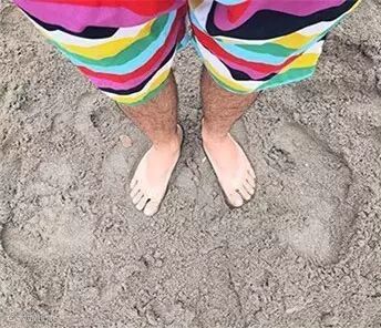 摄影师躺在脏乱的沙滩上,