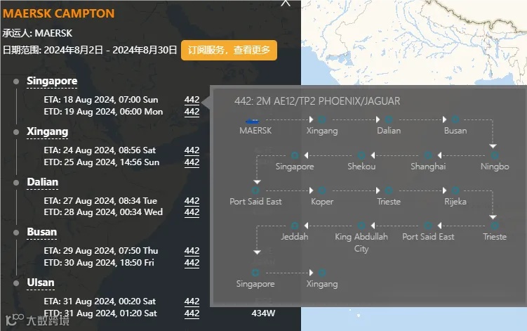 该航线在国内挂靠天津新港、大连、宁波、上海、深圳蛇口等港口。