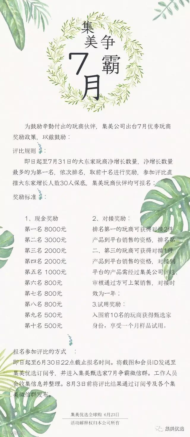 2017年6月23日-7月31日的大东家玩商净增长数量,净增长数量最多的为第一名,依次排名,取前十名进行奖励,参加评比的起点为净增长数量超过30位,集美玩商伙伴均可报名!