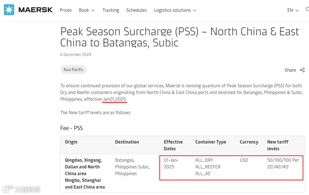 自2025年1月1日起调整从华北和华东港口出发,目的地为菲律宾马尼拉的干货和冷藏集装箱的旺季附加费(PSS)。