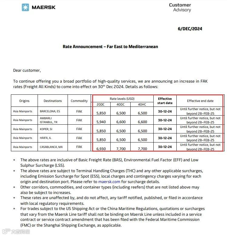 12月6日,马士基发布公告,自2024年12月30日起,提高远东至地中海的FAK费率。详情如下: