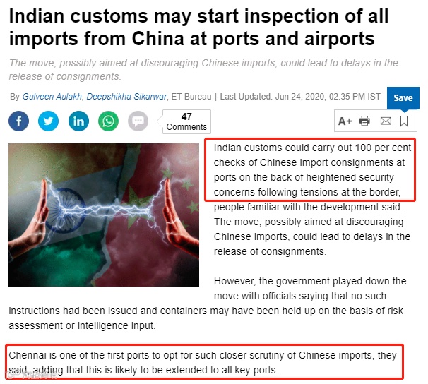 据印度经济时报报道,6月23日,印度金奈港停止对所有来自中国货物的清关工作,开始对来自中国货物100%实施检查(在此之前是随机检查),并很可能会扩展到印度所有主要港口。