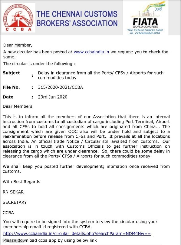 6月23日,印度金奈港口报关代理人协会(CCBA)内部也对所有会员发布了内部清关延迟通知,要求对所有来自中国的货物清关工作暂停,清关已经完成的货物也需要重新进行检查。印度海关官方目前尚未发布通知。货物的放行需要协会进一步与海关人员联系确认后才能允许,因此中国货物的清关工作将会有所延迟。