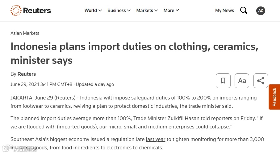 据路透社等媒体报道,印尼贸易部长Zulkifli Hasan6月28日在公开场合表示,印尼将对鞋类、服装、纺织品、化妆品和陶瓷等进口产品征收100%至200%的保障性关税,以重启并加强对国内产业的保护措施。