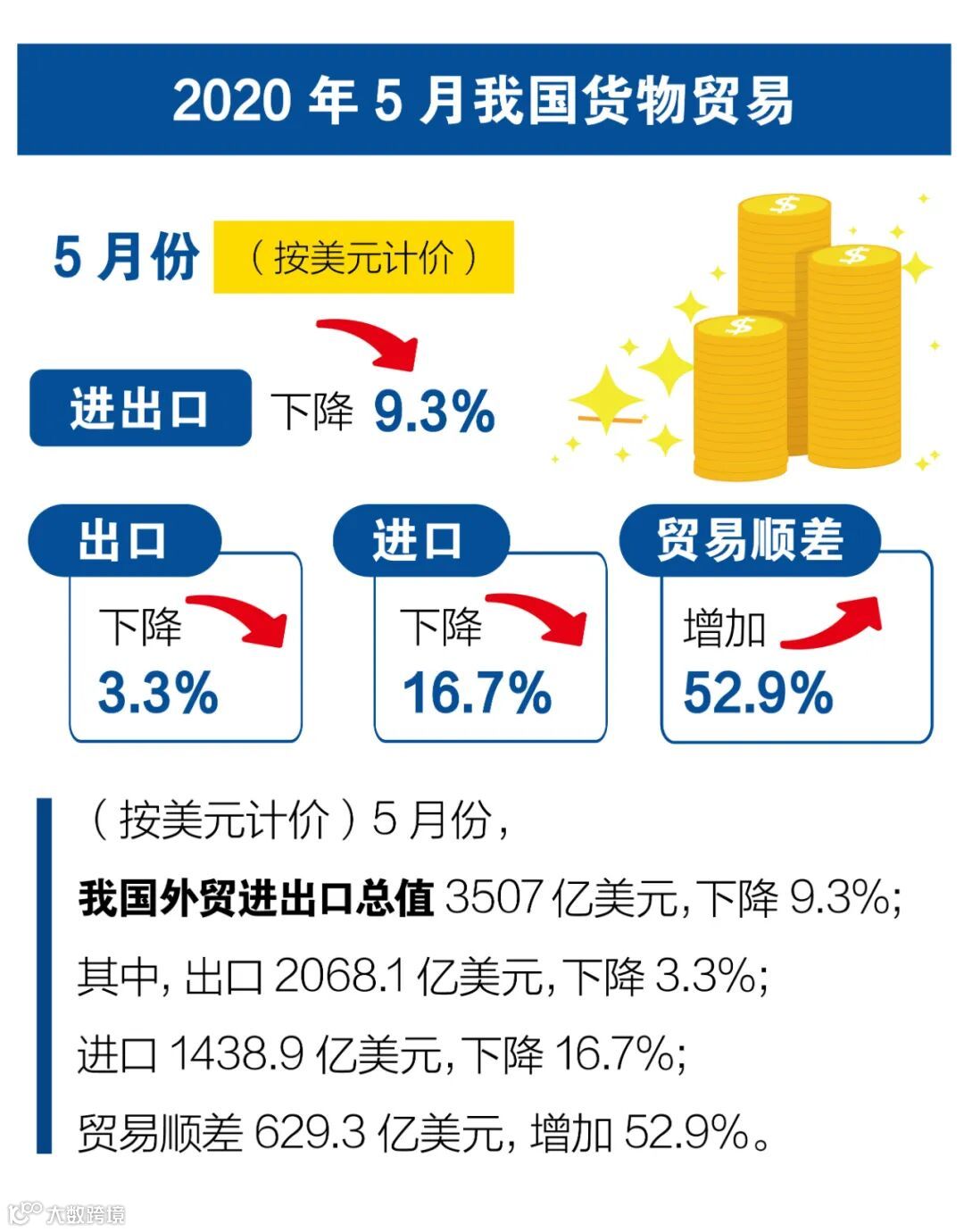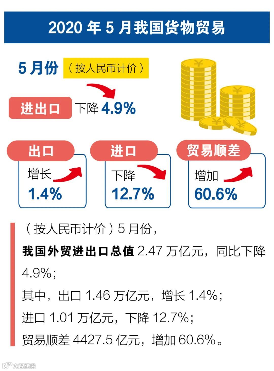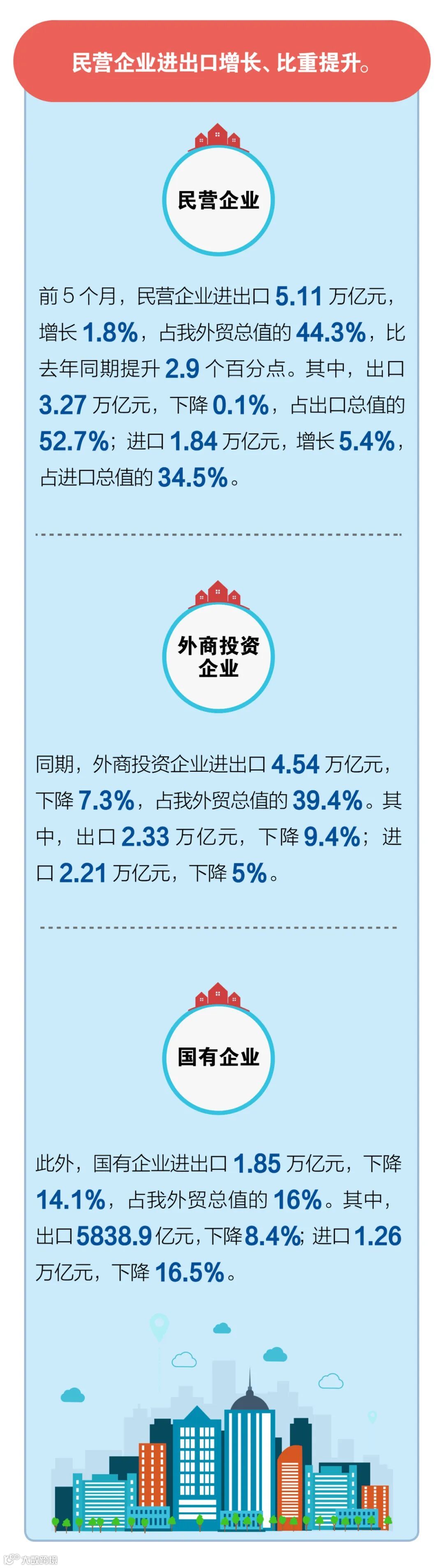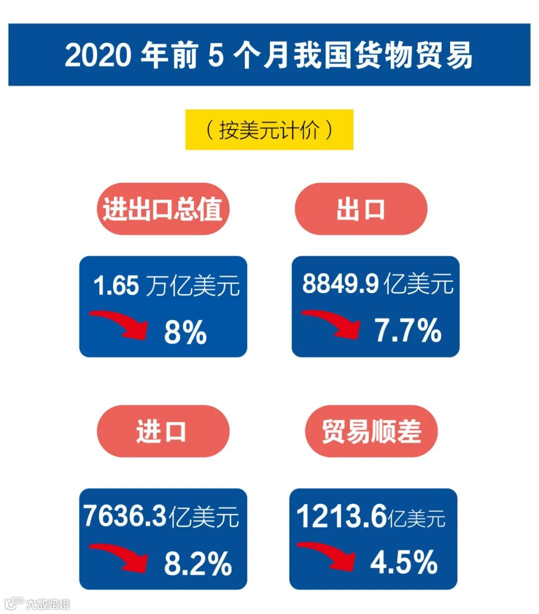 海关统计显示,今年1-5月,我国外贸进出口总值11.54万亿元,同比下降4.9%。其中,出口6.2万亿元,下降4.7%,进口5.34万亿元,下降5.2%。5月份当月,我国进出口总值2.47万亿元,同比下降4.9%;其中,出口1.46万亿元,增长1.4%,进口1.01万亿元,下降12.7%。