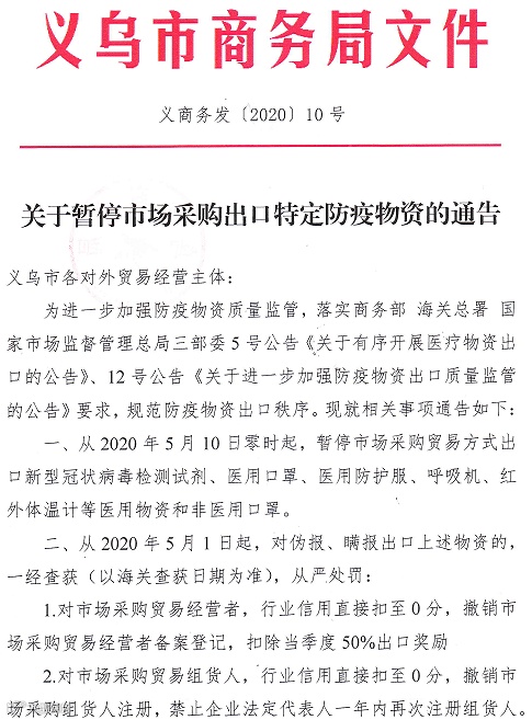 义乌市商务局官方微信5月9日发布《关于出口防疫物资的热点问题解答》,解答称,从5月10日起,全国范围暂停以市场采购贸易方式出口新型冠状病毒检测试剂、医用口罩、医用防护服、呼吸机、红外体温计等医用物资和非医用口罩(简称5+1类防疫物资)。