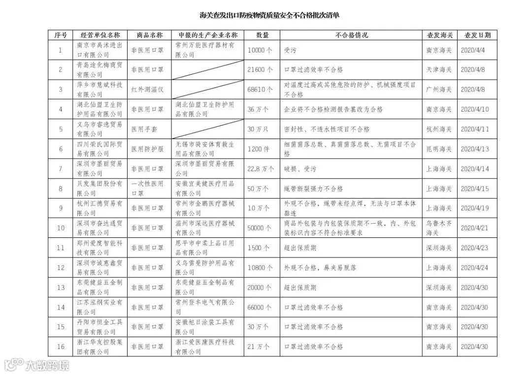在全球疫情持续蔓延的特殊时期,为深化疫情防控国际合作、共同应对全球公共卫生危机,海关总署坚决贯彻党中央、国务院决策部署,全面加强出口防疫物资质量监管,严格规范出口秩序。对于在出口环节查获的霉变、残损、受污、超出保质期以及经实验室检测质量安全项目不合格的防疫物资,海关除依法给予行政处罚、符合刑事立案标准的移送司法机关追究刑事责任外,还将采取下调信用评级、提高查验比例、依法暂停或取消有关资格资质、曝光违法违规信息等多种惩戒措施,使其“一处失信,处处受限”。现将全国海关近期查发的出口防疫物资质量安全不合格企业及相关产品批次予以公布。