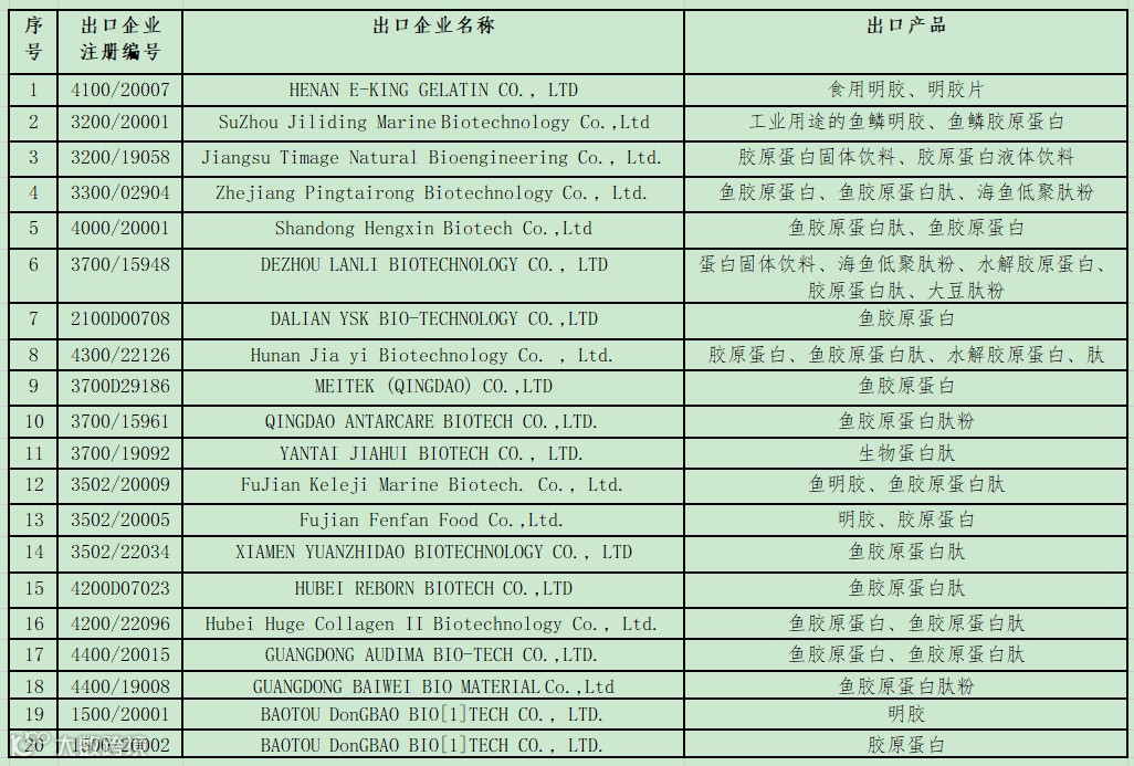据俄罗斯联邦兽医和植物卫生监督局官网消息:该局近日发布N.ФС-ЮШ-7/19731号指令,宣布自2024年10月1日起,我国多家企业产品:鱼胶原蛋白、鱼胶原蛋白肽和明胶等允许出口俄罗斯,相关信息参考如下: