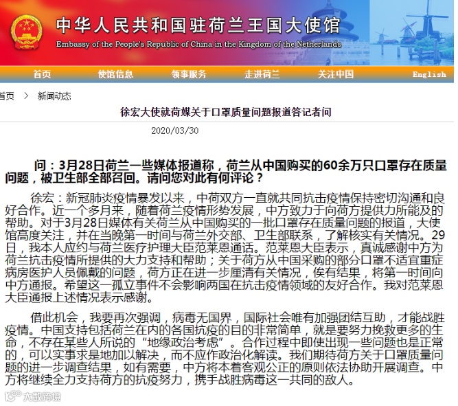 3月21日,一家中国工厂生产的标明为”KN95“等级的口罩,配有质量检验合格证,运达荷兰。不久,荷兰卫生部收到警报,提醒这批到货的口罩不符合检验标准,既不符合FFP2的标准也不符合安全性较低的FFP1,充其量只是某种FFP0.8。”根据欧洲标准,FFP2口罩的过滤效率应达到94%,FFP1口罩的过滤效率应达到80%。他们还指出,这批口罩的问题出在不能正确地覆盖脸部,或者捕获病毒粒子的膜状物不能够正确地运作。