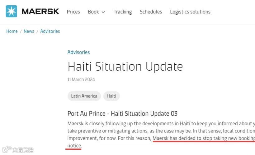 此前消息,马士基决定停止接受往返海地的新订舱,直至另行通知。