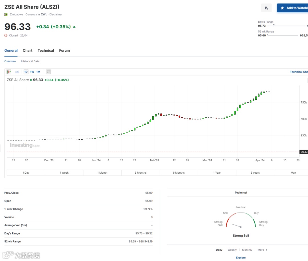 截至当地时间4月22日周一收盘,津巴布韦全股指数报96.33点。