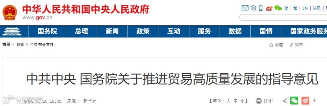 国务院发布了《关于推进贸易高质量发展的指导意见》,这或将是推动贸易转型、优化结构、高质量发展的顶层设计。