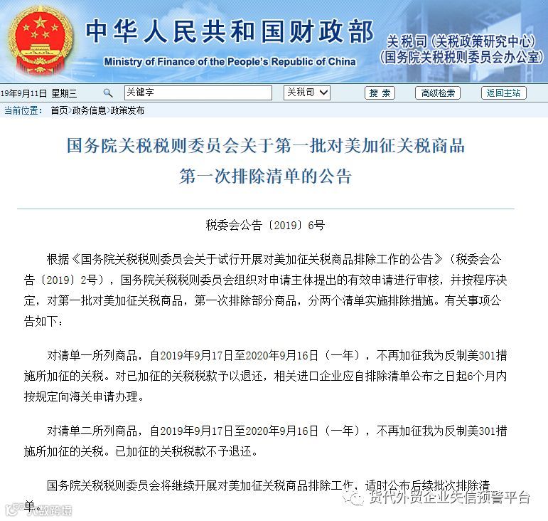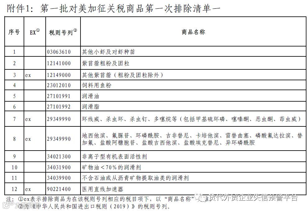 根据《国务院关税税则委员会关于试行开展对美加征关税商品排除工作的公告》(税委会公告〔2019〕2号),国务院关税税则委员会组织对申请主体提出的有效申请进行审核,并按程序决定,对第一批对美加征关税商品,第一次排除部分商品,分两个清单实施排除措施。有关事项公告如下: