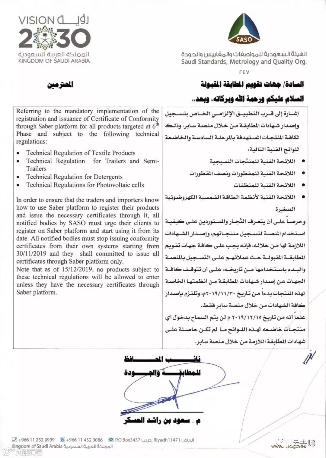 继沙特阿拉伯标准组织(SASO)引入沙特产品安全计划SALEEM后,沙特当局于2019年1月1日启动了名为“SABER”的新在线认证系统并逐步实施技术规范(TR)。