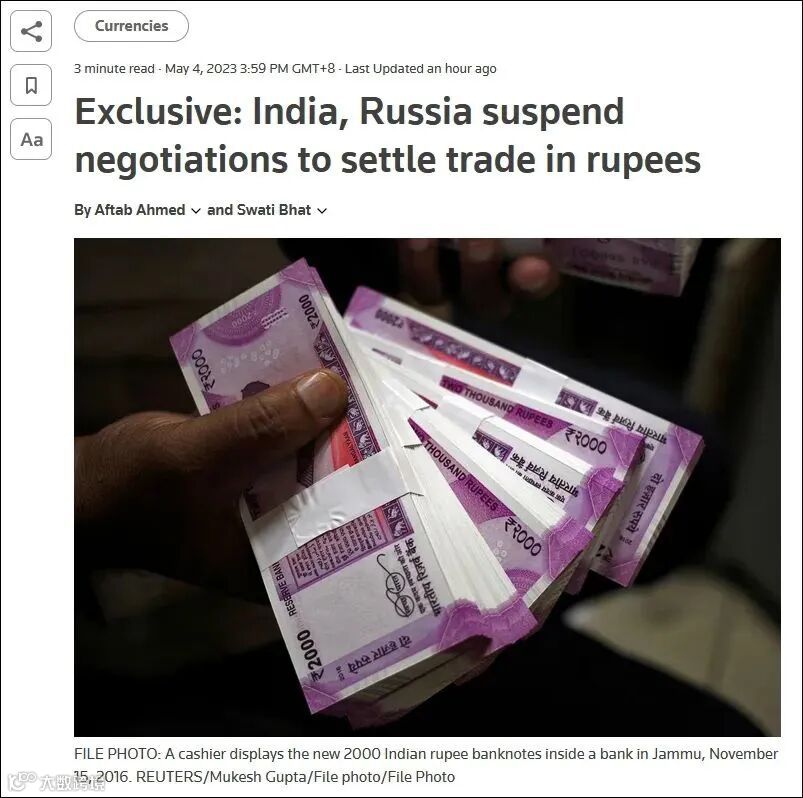 5月4日,据路透社援引多名印度官员和知情人士报道,俄罗斯和印度已暂停有关用卢比结算双边贸易的谈判,俄方认为持有卢比“不划算”,希望用人民币等货币进行支付。