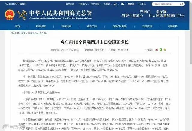11月7日,海关总署公布今年前10个月外贸数据。我国单月进出口同比增速在经历连续4个月负增长后,终于实现由负转正。10月份,我国进出口额达3.54万亿元,同比增长0.9%。其中,出口1.97万亿元,同比下降3.1%;进口1.57万亿元,同比增长6.4%。