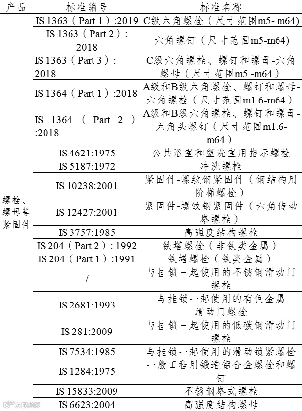 印度发布螺栓、螺母等紧固件质量控制令