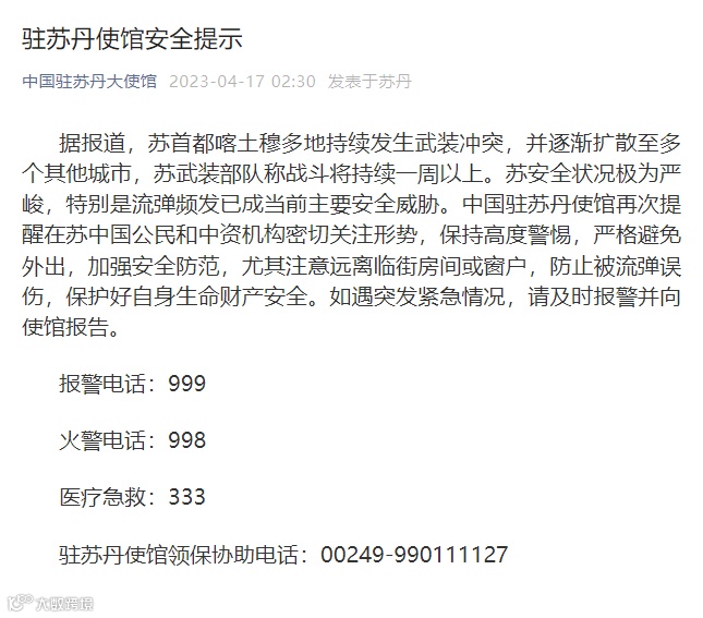 中国驻苏丹大使馆17日在微信公众号再发安全提醒,称苏丹首都喀土穆多地持续发生武装冲突,并逐渐扩散至多个其他城市,苏武装部队称战斗将持续一周以上。苏安全状况极为严峻,特别是流弹频发已成当前主要安全威胁。