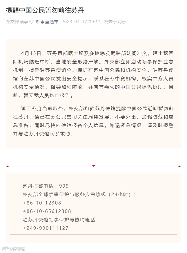 17日,据“领事直通车”微信公众号消息,外交部领事司发布通知提醒中国公民暂勿前往苏丹。