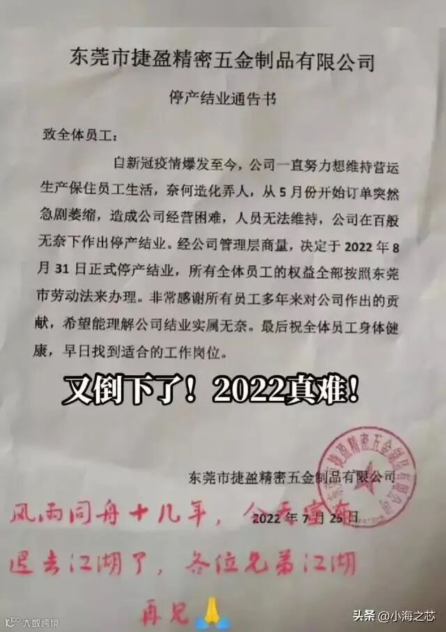 近日,继大型制造企业东莞市库珀电子有限公司发文宣布“停产结业,员工正式解散”后,又有几家制造业企业宣布停产结业。