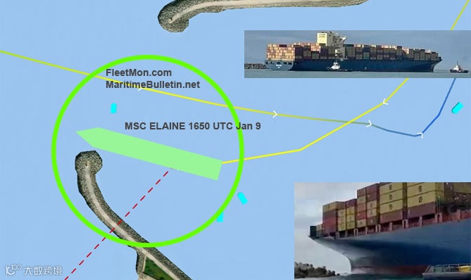 来自MarineTraffic.com的AIS数据显示,这艘340米长的集装箱船“MSC Elaine”号船在当地时间1月9日周一早上9点左右离开港口时失控,并在港口入口处的防波堤处发生搁浅。