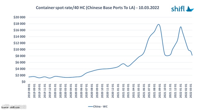 数字货运代理平台Shifl的一份报告称,自1月初达到顶峰以来,中国与美国西海岸和美国东海岸之间的跨太平洋集装箱即期运费一直在稳步下降。特别是,与2022年1月相比,2022年3月西海岸的运费下降了52%,东海岸的运费下降了50%。