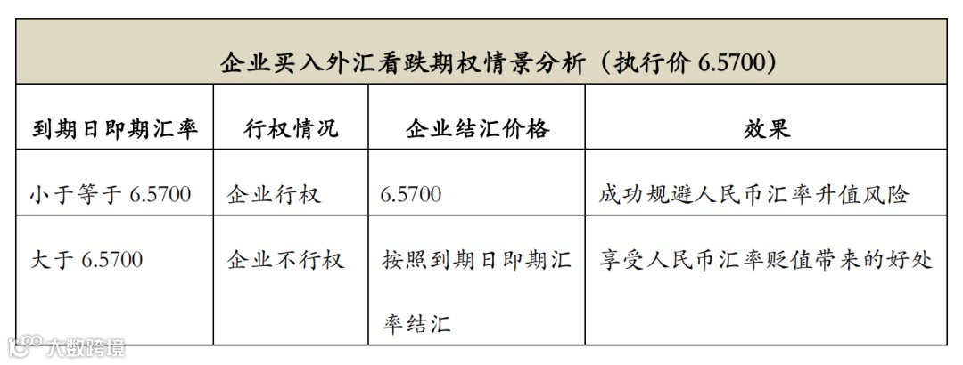到期日,一是若人民币汇率升值至6.5000,则企业行权,可按照6.5700价格结汇,成功规避了升值风险;二是若人民币汇率贬值至 6.8000,则企业放弃行权,可按照6.8000 结汇,享受人民币汇率有利变动带来的好处。