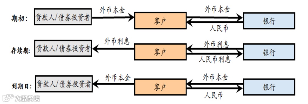 人民币外汇货币掉期是银行为企业提供的,在期初期末以相同汇率交换本外币本金,存续期间以约定汇率和利率交换利息的外汇衍生产品。以企业持有外币贷款或发行外币债 券场景下,与银行签订外汇货币掉期合约为例,现金流交换 情况如下: