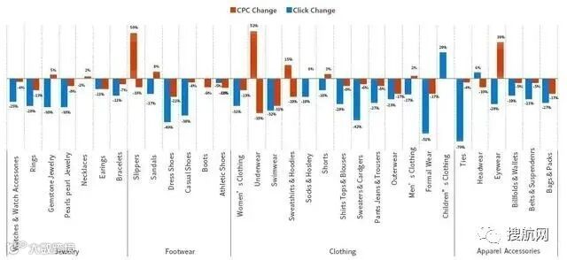 美国市场在多数细分产品搜索量每况日下的同时,拖鞋(Slippers)、内衣(Underwear)等家居必备品的搜索是逆势增长,让人奇怪的是正装(Formal wear)的搜索点击量也逆势增长,这可能与美国人的生活习惯有关,也是很重要的一点。