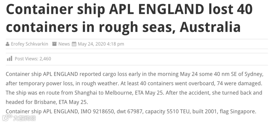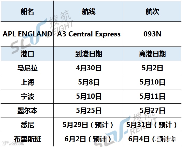 据悉,本次发生重大事故的集装箱为 APL ENGLAND轮,目前服务于A3 Central Express(简称A3C)航线,事发时正执行093N航次,起运港包括中国前两大港口上海港和宁波港,目的地为澳洲的墨尔本,悉尼和布里斯班港。