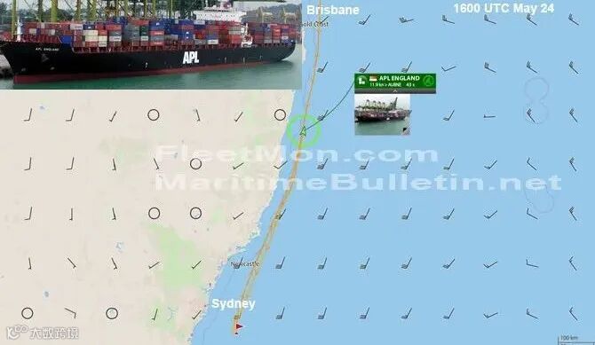 结合多家共舱船公司的资料以及集装箱船的航线及位置图分析,APL ENGLAND轮原计划挂靠的挂靠为澳大利亚悉尼港,因为此次突发事故,该轮转而去往另外一个港口布里斯班。