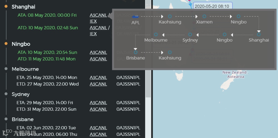 该船于5月25日从上海途中到达ETA墨尔本,目前已前往ETA布里斯班。