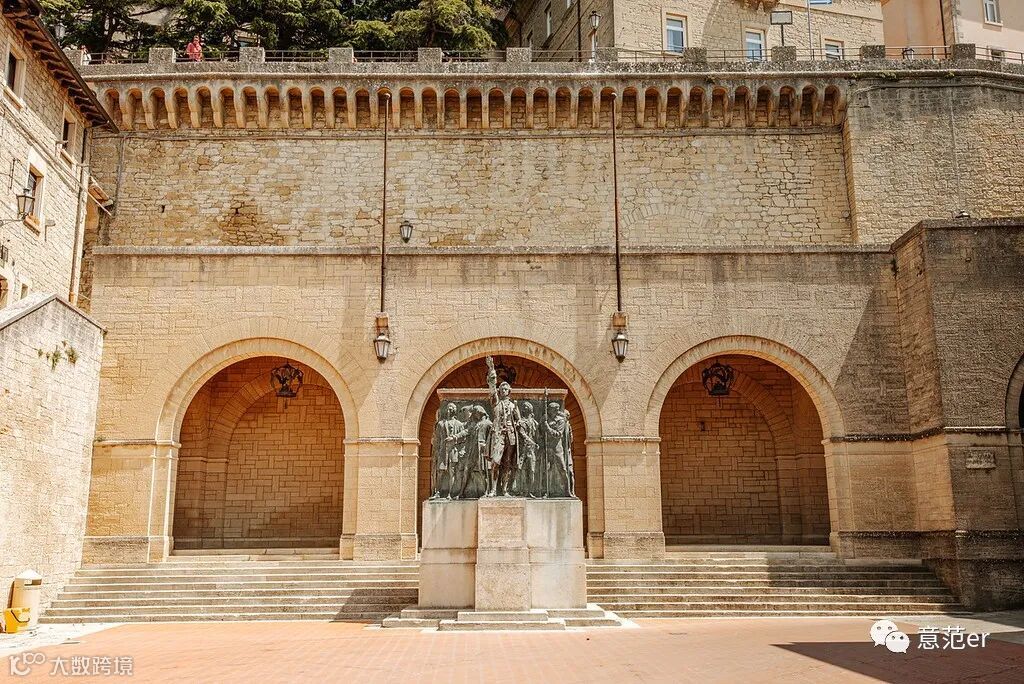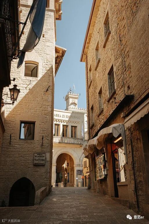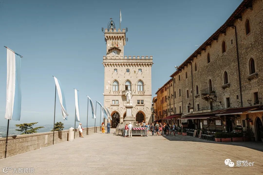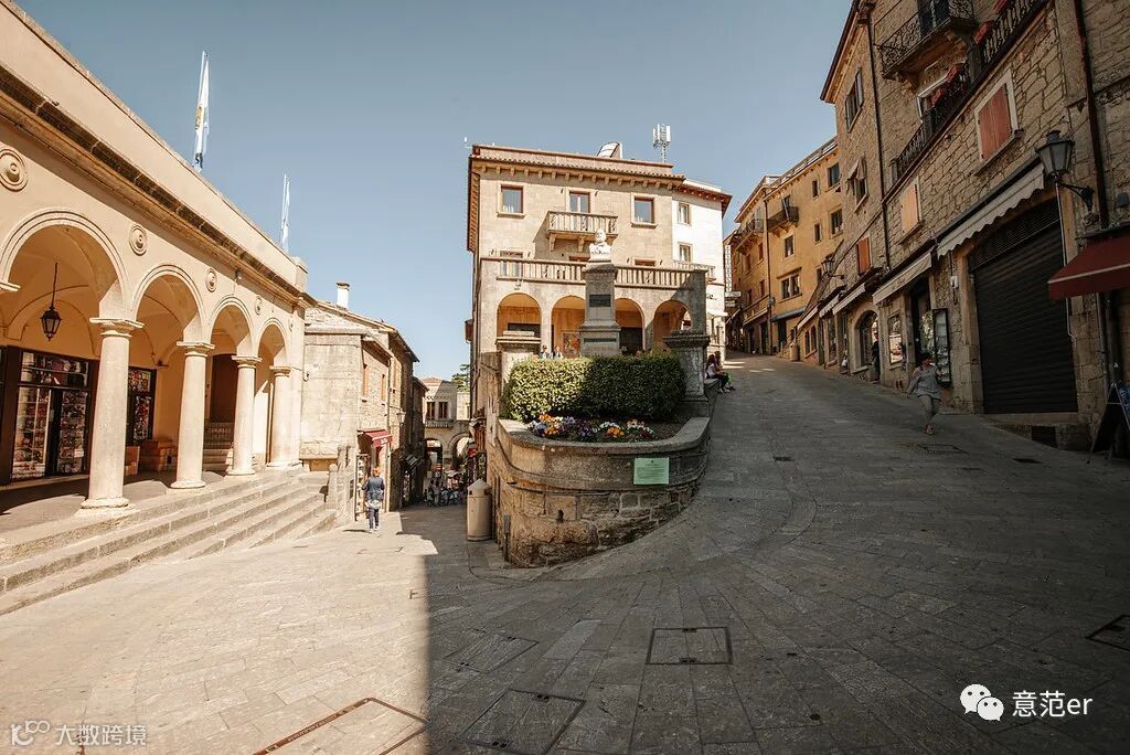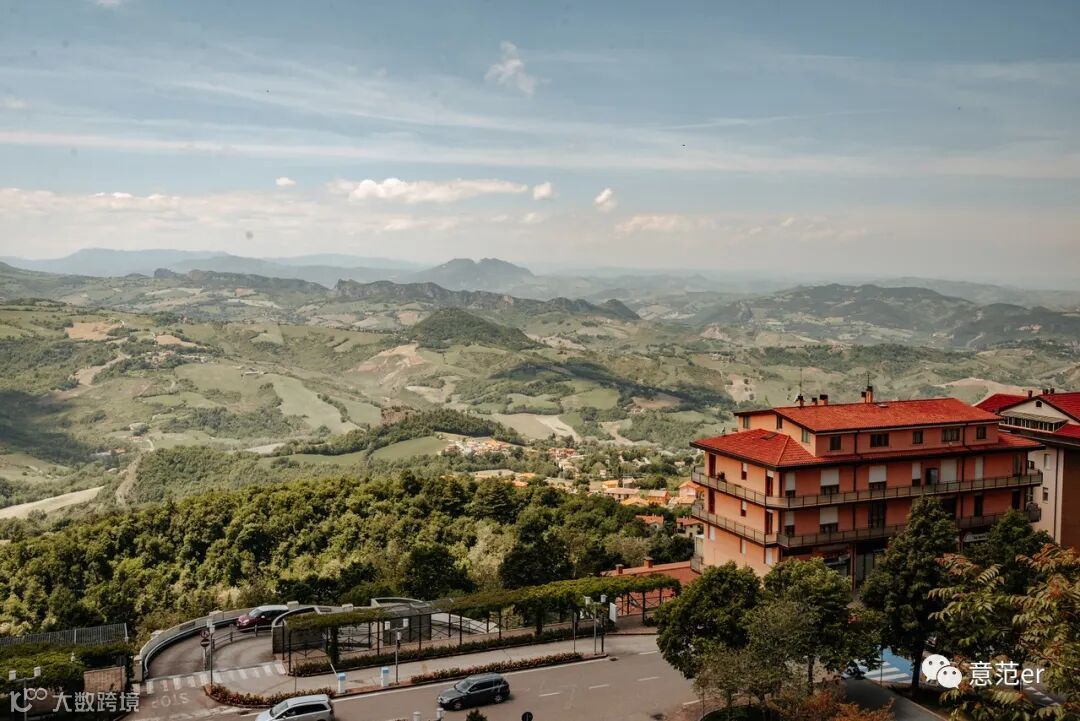 进入圣马利诺不用经过边境检查,但是还是可以感觉到与意大利不同之处。除了明显的车牌、旗帜之外,圣马利诺的建筑多为米色,与意大利中部常见的土黄色相较,似乎贵气一些(它的人均购买力的确在世界上名列前茅)。 街道也十分干净整齐,又因为高居山上,气温凉爽许多。