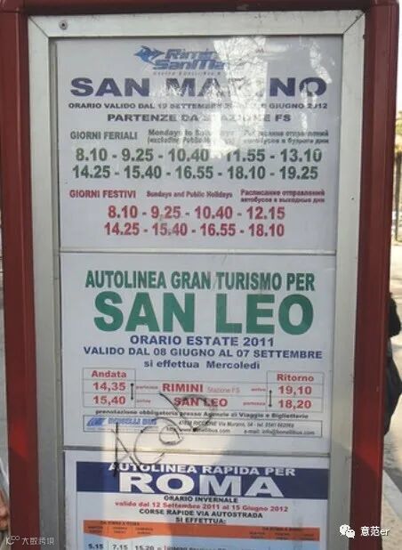 火车站一出来左手边的马路上有一堆公车站牌,可是往圣马力诺的巴士不在这边搭。往圣马力诺的巴士站位于出火车站右斜前方对面的马路旁,过马路后沿着人行道走一小段就可以找到。从Rimini往圣马力诺大约需要50分钟车程,车票单程4欧元,往返8欧元。