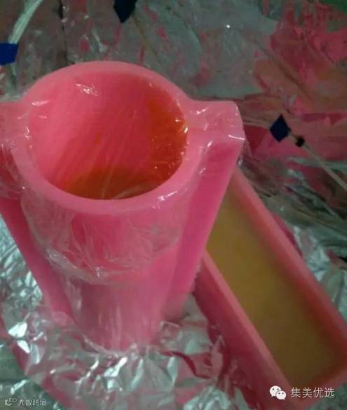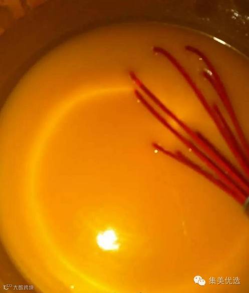 把配方里的植物油倒进不锈钢盆子里。因为棕榈用的红棕所以油的颜色是红色