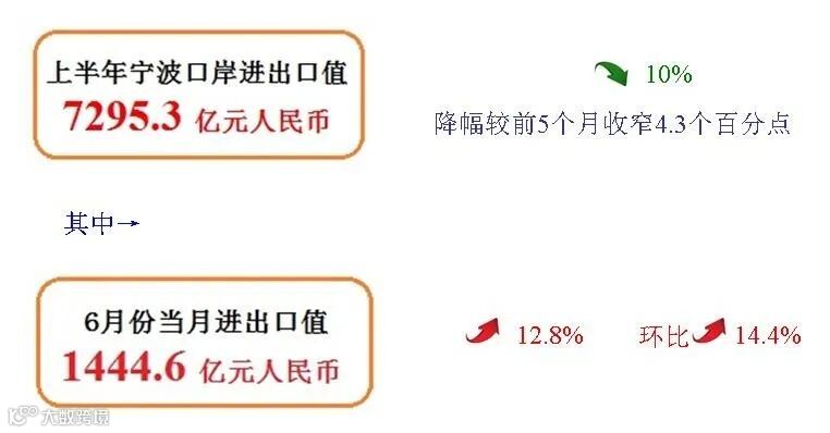 据宁波海关统计,上半年宁波口岸进出口值达7295.3亿元人民币(下同),与去年同期(下同),相比下降10%,降幅较前5月收窄4.3个百分点。其中,进口2103.1亿元,下降13.6%,出口5192.2亿元,下降8.4%。