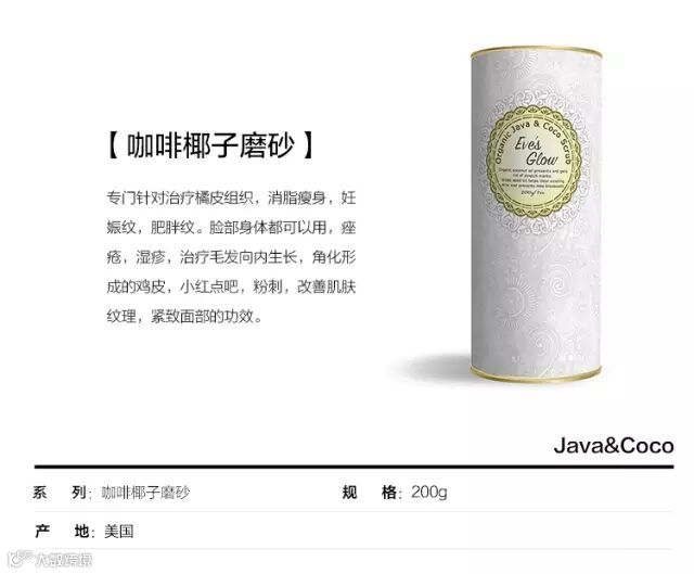 【java&coco天然有机咖啡椰子磨砂】专门针对治疗橘皮组织,消脂瘦身,妊娠纹,肥胖纹。脸部身体都可以用,痤疮,湿疹,治疗毛发向内生长,角化行成的鸡皮,小红点,粉刺,改善肌肤纹理,紧致面部的功效。