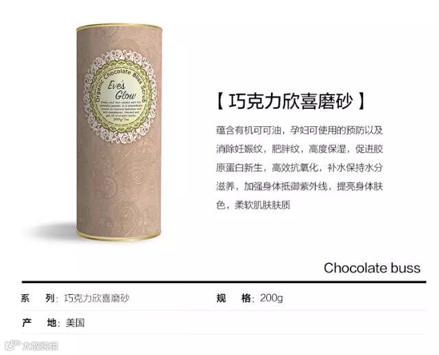 【Chocolate Bliss天然有机巧克力磨砂】蕴含有机可可果油,孕妇可使用的预防以及消除妊娠纹,肥胖纹,高度保湿,促进胶原蛋白新生,高效抗氧化,补水保持水分滋养,加强身体抵抗紫外线,提亮身体肤色,柔软肌肤肤质。