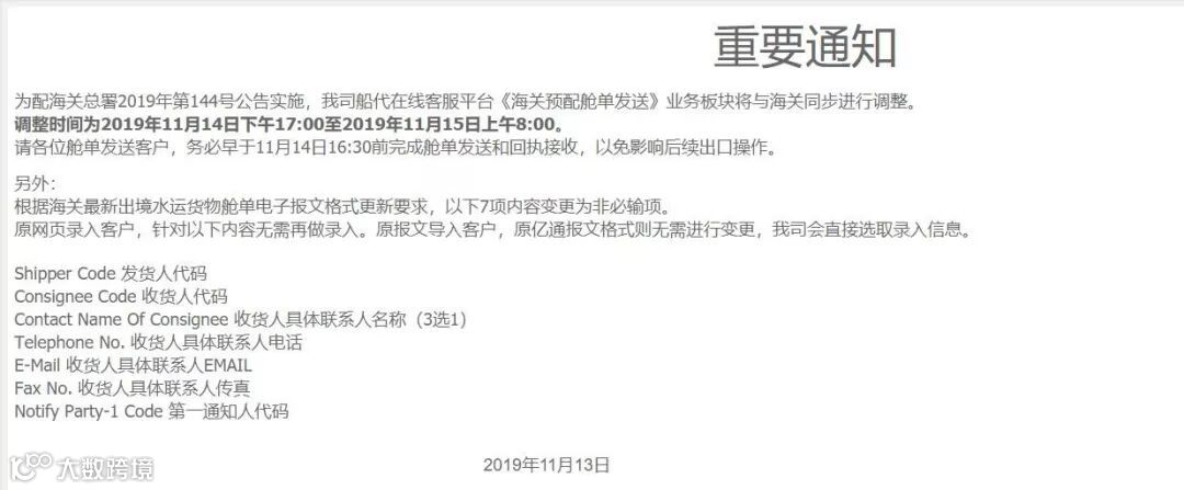 2h,非集装箱货物,开始装载货物的2小时以前发送;国际转运货物、空箱,在开始装载货物、空箱的2小时以前发送