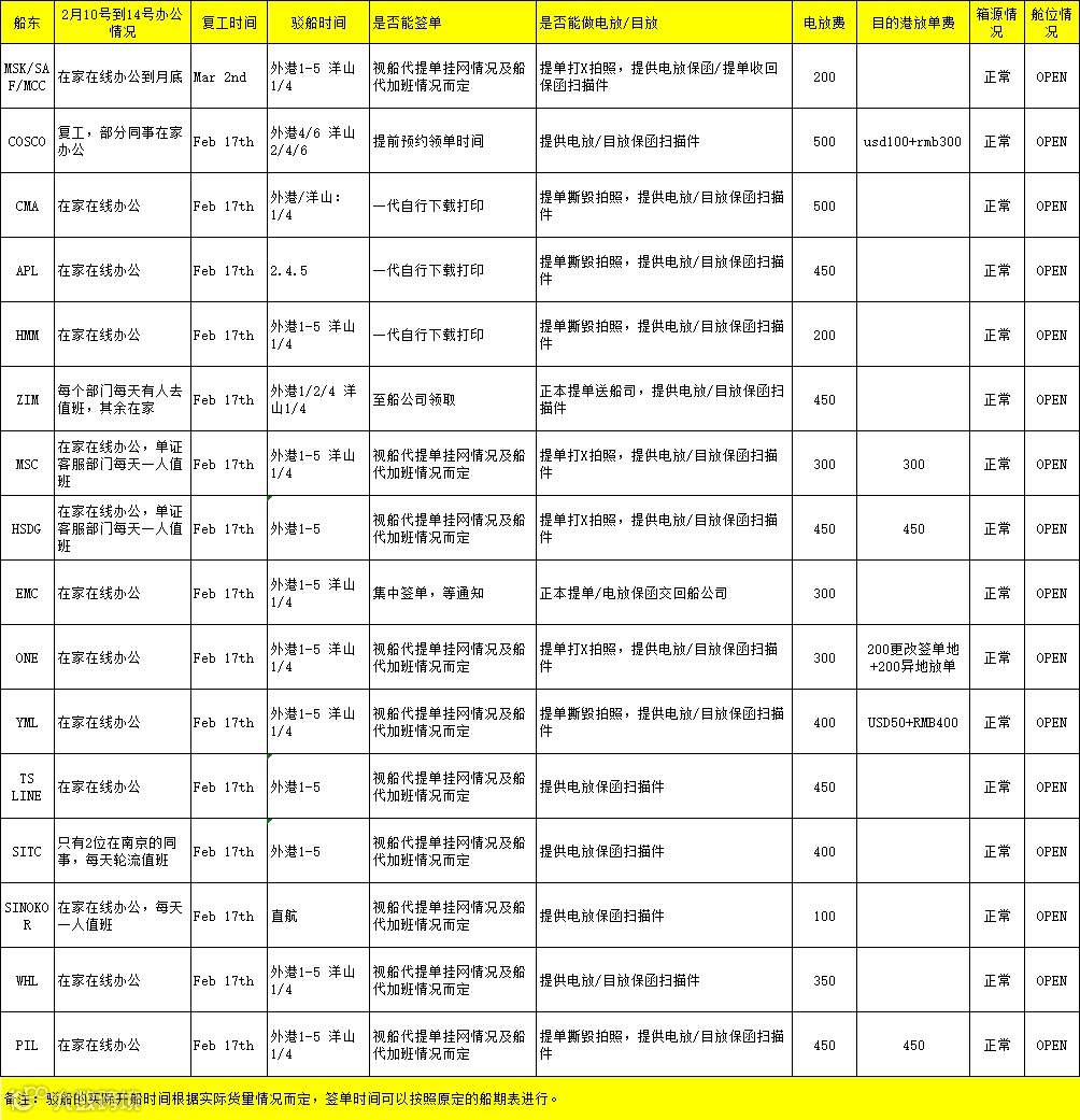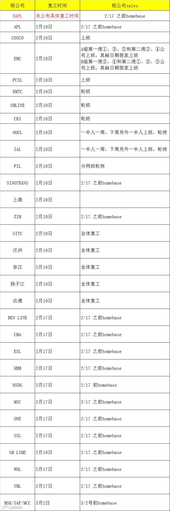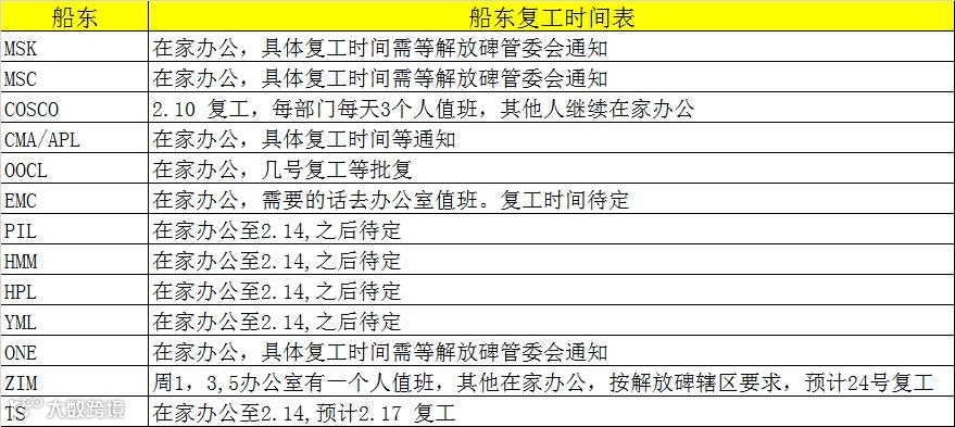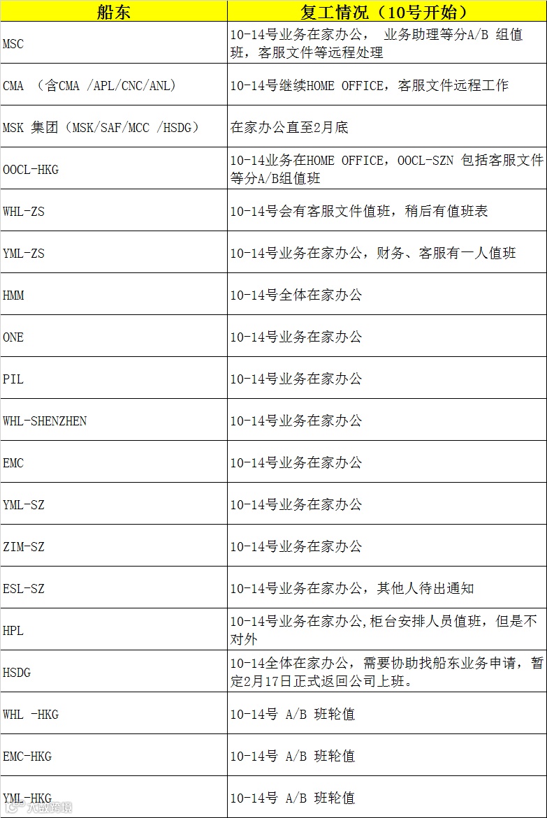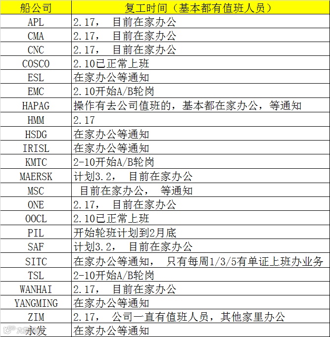 船公司各口岸复工情况