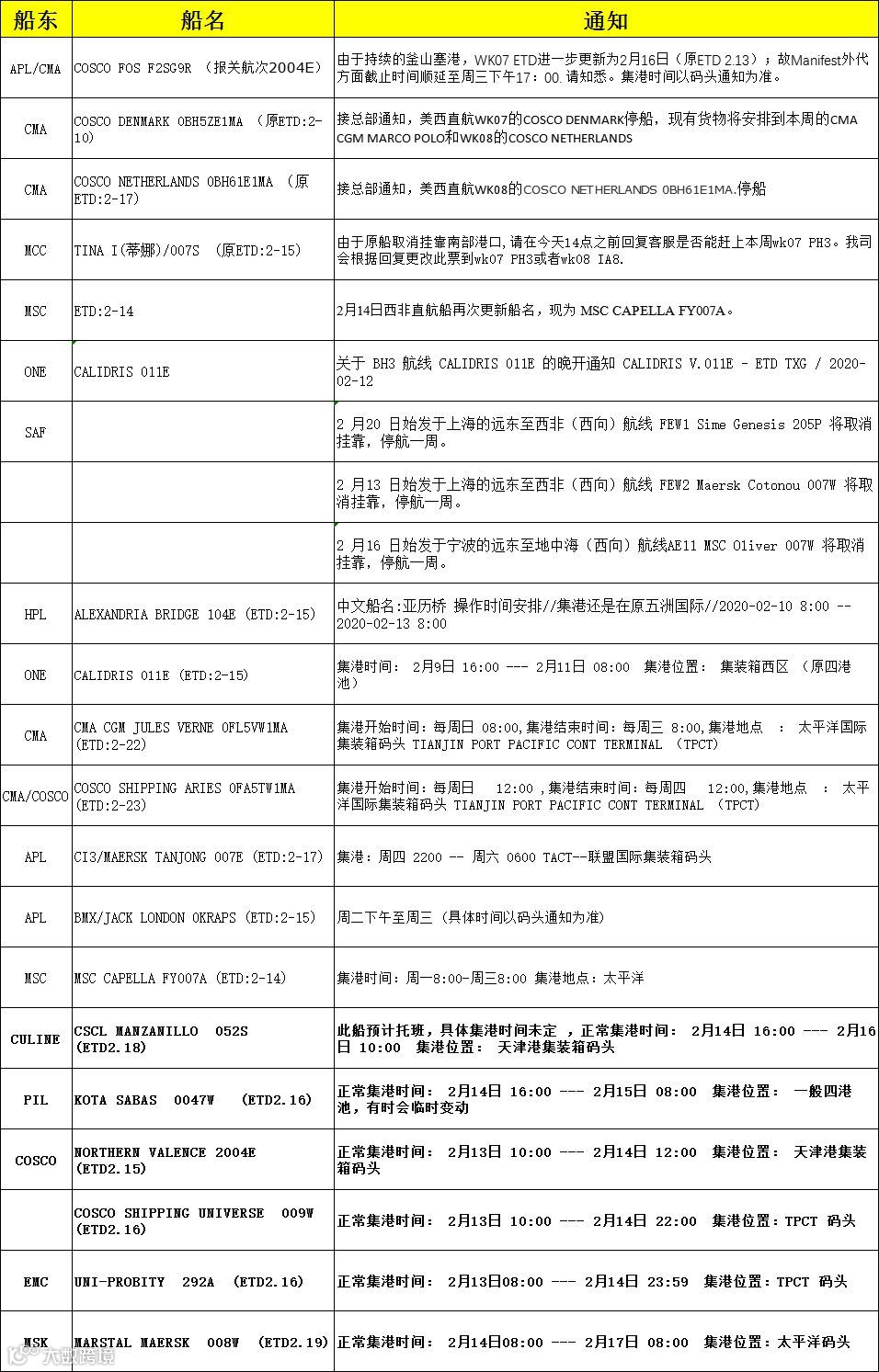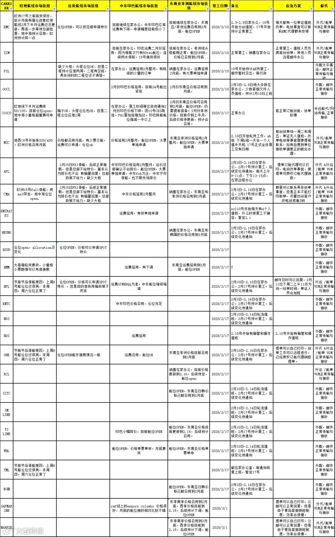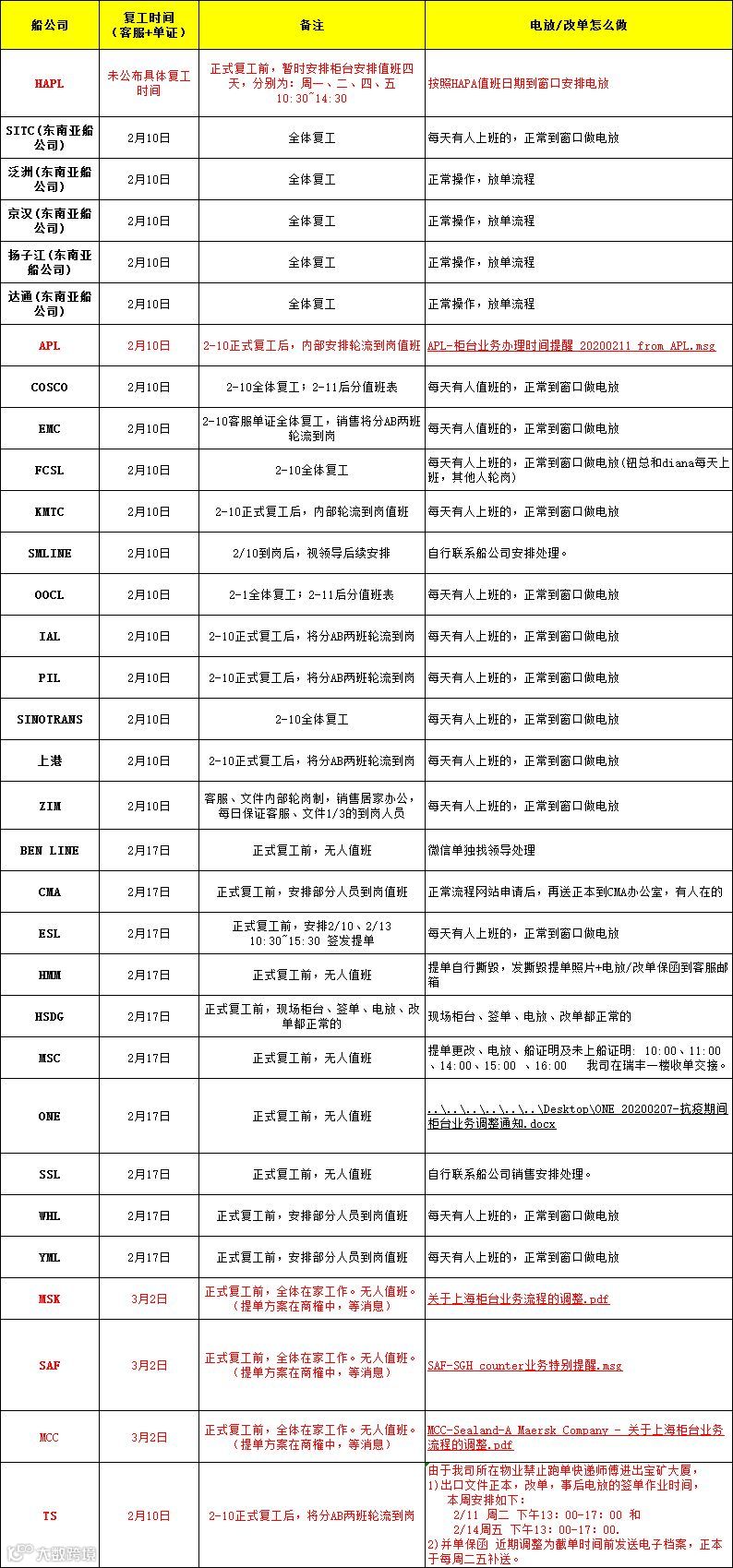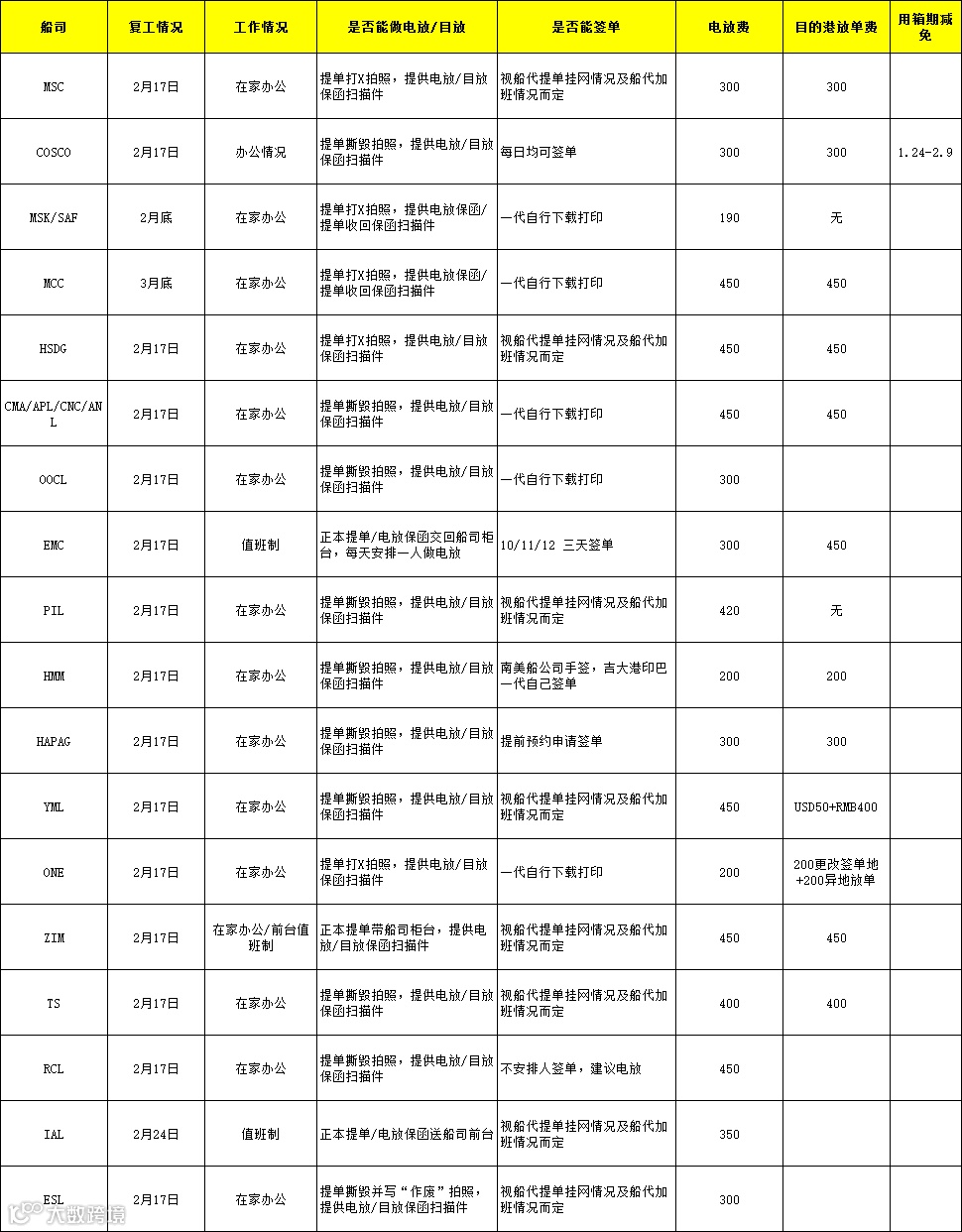 船公司各口岸复工情况