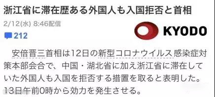 日本首相安倍晋三在12日举行的新型冠状病毒感染症对策会议上表示,除了中国湖北省之外,去过浙江省的外国人也将采取被拒绝入境的措施,从13日0点开始生效。