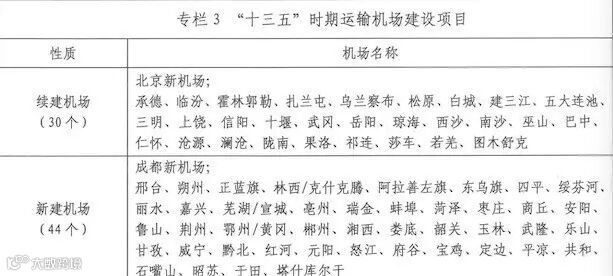 在《规划》“十三五”时期机场建设项目的表格中,北京新机场等续建机场项目有30个;成都新机场、平凉、湘西、邢台等新建机场项目44个;广州、浦东、虹桥、深圳、成都等城市的改扩建机场项目达到139个。