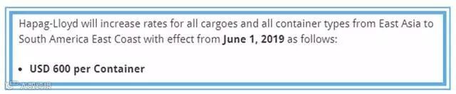 Hapag Lloyd自2019年6月1日起,从东亚到南美东海岸的所有货物和所有集装箱类型的FAK费率将上调如下:
