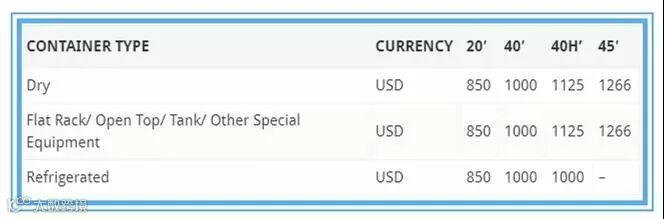 所有超过21吨的货物,每20 '货柜需加收100美元附加费。