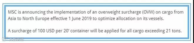 MSC宣布将于2019年6月1日起对从亚洲到北欧的货物征收超重附加费(OVW),以优化其船舶的配置。