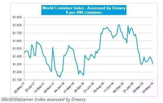 2019年5月23日,Drewry更新了世界集装箱指数,来自美国,欧洲和亚洲的8条主要航线的集装箱运费综合指数下跌3.9%至每40英尺集装箱1310.07美元。